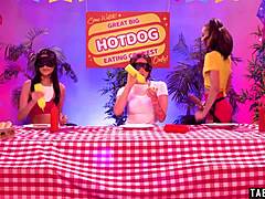 Blonde housewife Liisa and ebony Kelly share a huge dildo