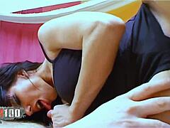 Passionate blowjob in bed with cum on face from tanned bbw cutie stepmommy who's super horny at hard cock 😈