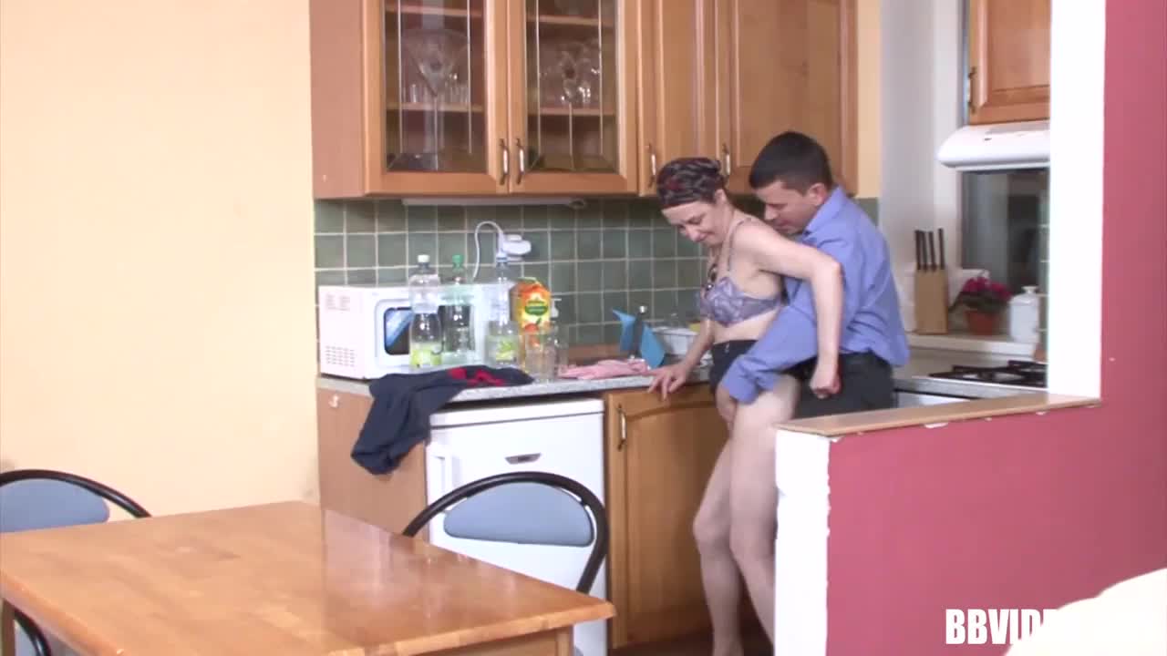 the housewife with big boobs licks and sucks cock, then rides it wet in the kitchen