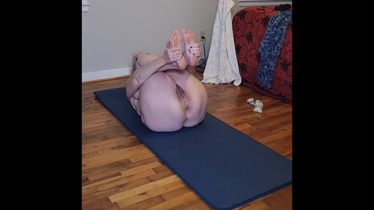 fit milf bends naked, showing huge tits in yoga pose