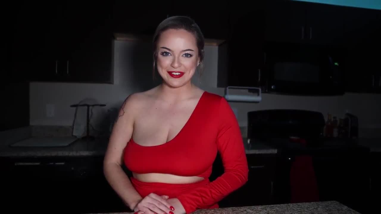 The busty milf stepmom with big natural tits gets a facial cumshot from her stepdad in the home kitchen.